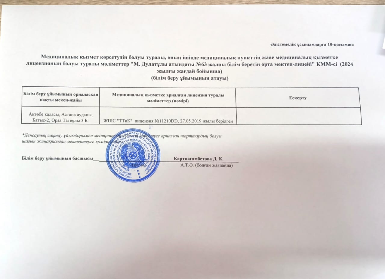 | Медициналық қызмет көрсетудің болуы, оның ішінде медициналық пункттің болуы және медициналық қызметке берілген лицензия туралы мәліметтер |